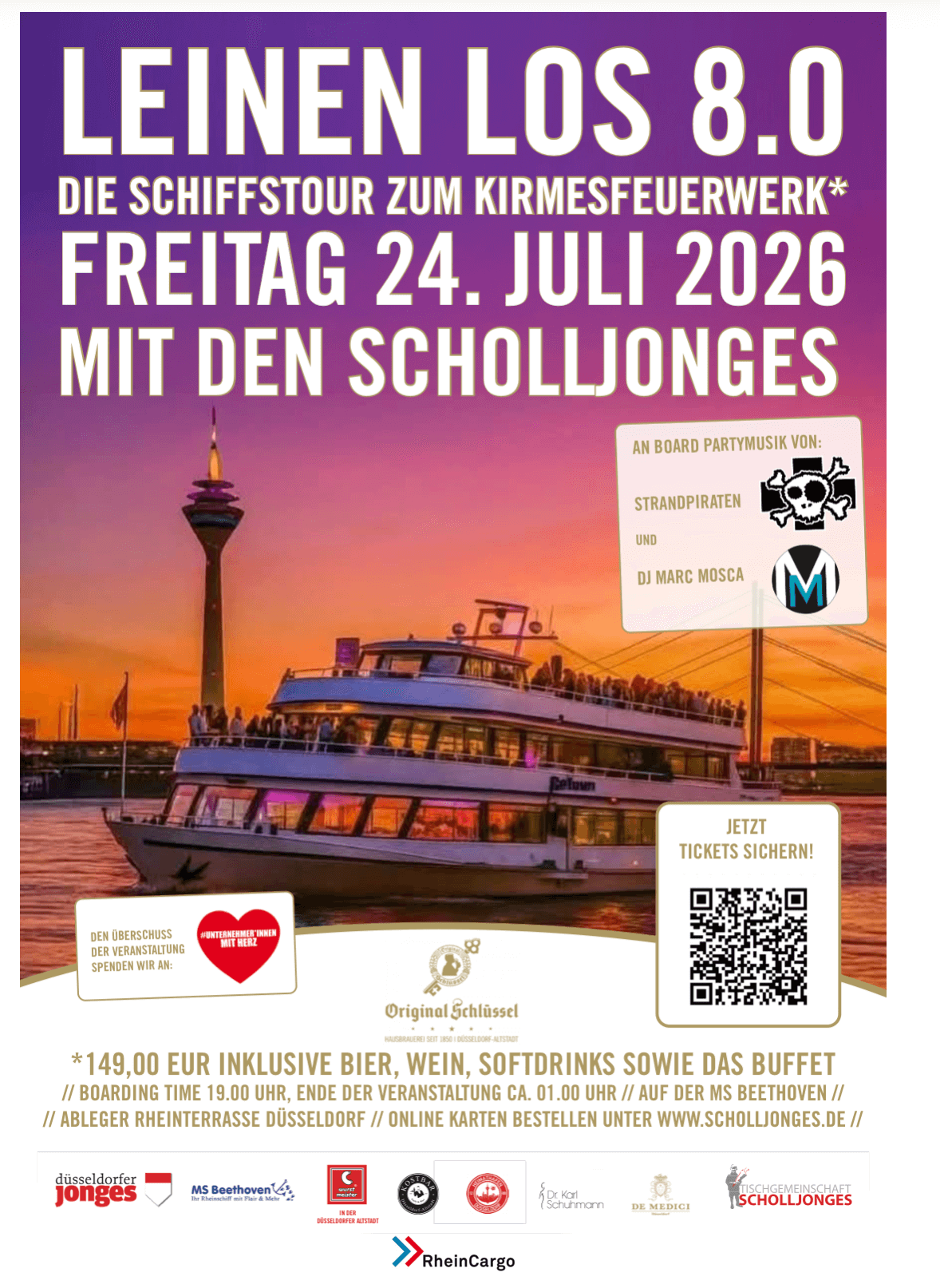 Während die MS Beethoven sanft über den Rhein gleitet, erwartet euch ein hochwertiges Gesamtpaket: erstklassiges Buffet, alle Getränke unter anderem Schlüssel Alt vom Fass inklusive und ein Unterhaltungsprogramm, das begeistert. Die Strandpiraten und DJ Marc Mosca (Ibiza Summer Festival, Ufer 8, Fischmarkt, CSD Berlin) bringen internationale Club-Atmosphäre aufs Deck, während Zauberkünstler Thorsten Happel (Monday Night Magic, New York, Kommödchen) euch mit Close-up-Magie direkt am Tisch ins Staunen versetzt.